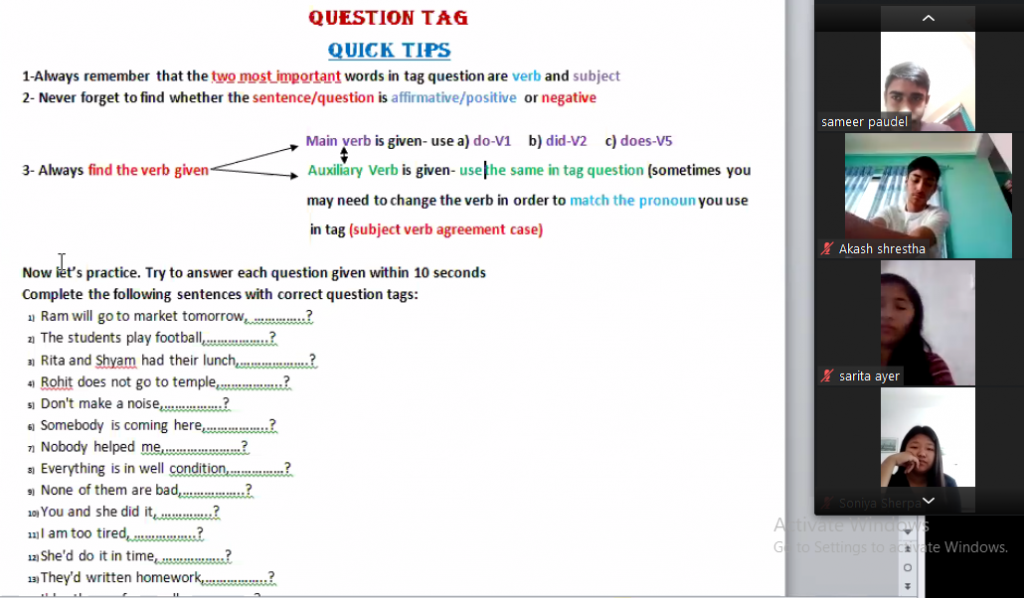 अघिल्लो दुई हप्ताको लागि विभिन्न होम एसाइमेन्ट विद्यार्थीलाई दिइएको र दोस्रो हप्ता सकिनासाथ स्कुलले अनलाइन कक्षाहरु सुरु गरेको स्कुलका इन्चार्ज सरोज शर्माले जानकारी दिनुभयो।